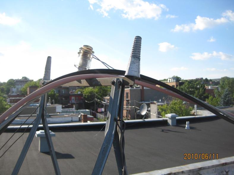 The wires providing the electrical service to this triplex are no longer supported by non conductive insulators. The rusted support structure is eating away at the protective plastic coating with every gust of wind. Immediate attention is required.
